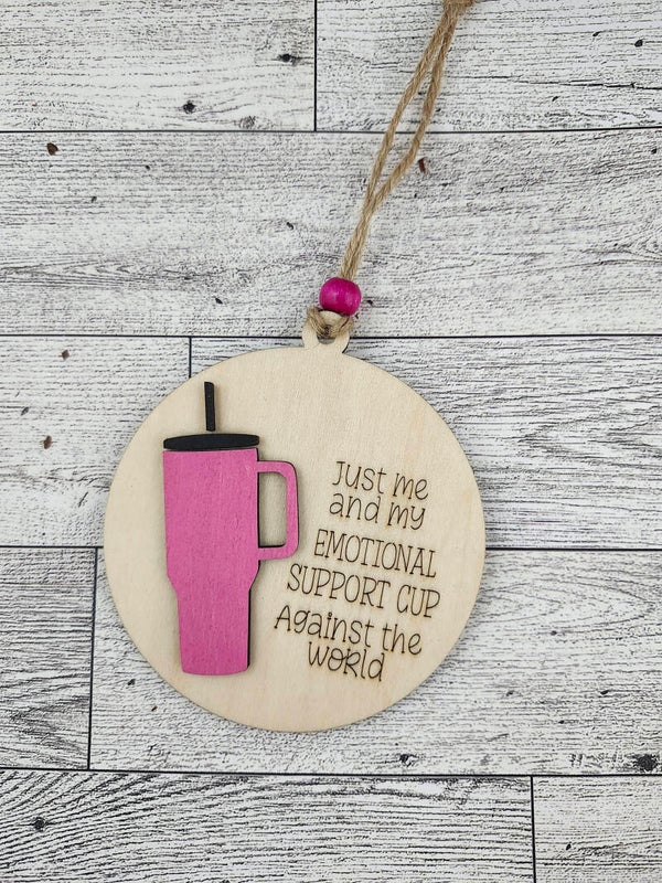 A small, festive Tumbler ornament, 3.5 inches in diameter, with a comical phrase. You pick the color for the tumbler and will come with a white lid and straw.