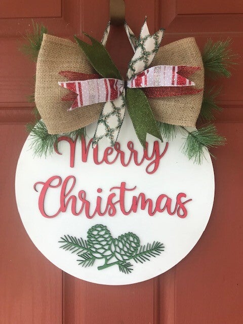 Add a festive touch to your home with our beautifully 14” handcrafted "Merry Christmas" Door Hanger. This made-to-order sign is crafted from a sturdy ¼” round wooden circle and topped with a coordinating bow and finished with a durable ribbon hanger, this unique piece will make a charming statement on any front door or wall. Each piece is meticulously hand-painted with durable outdoor acrylic paints, ensuring it stands up to the elements while looking great all season long.