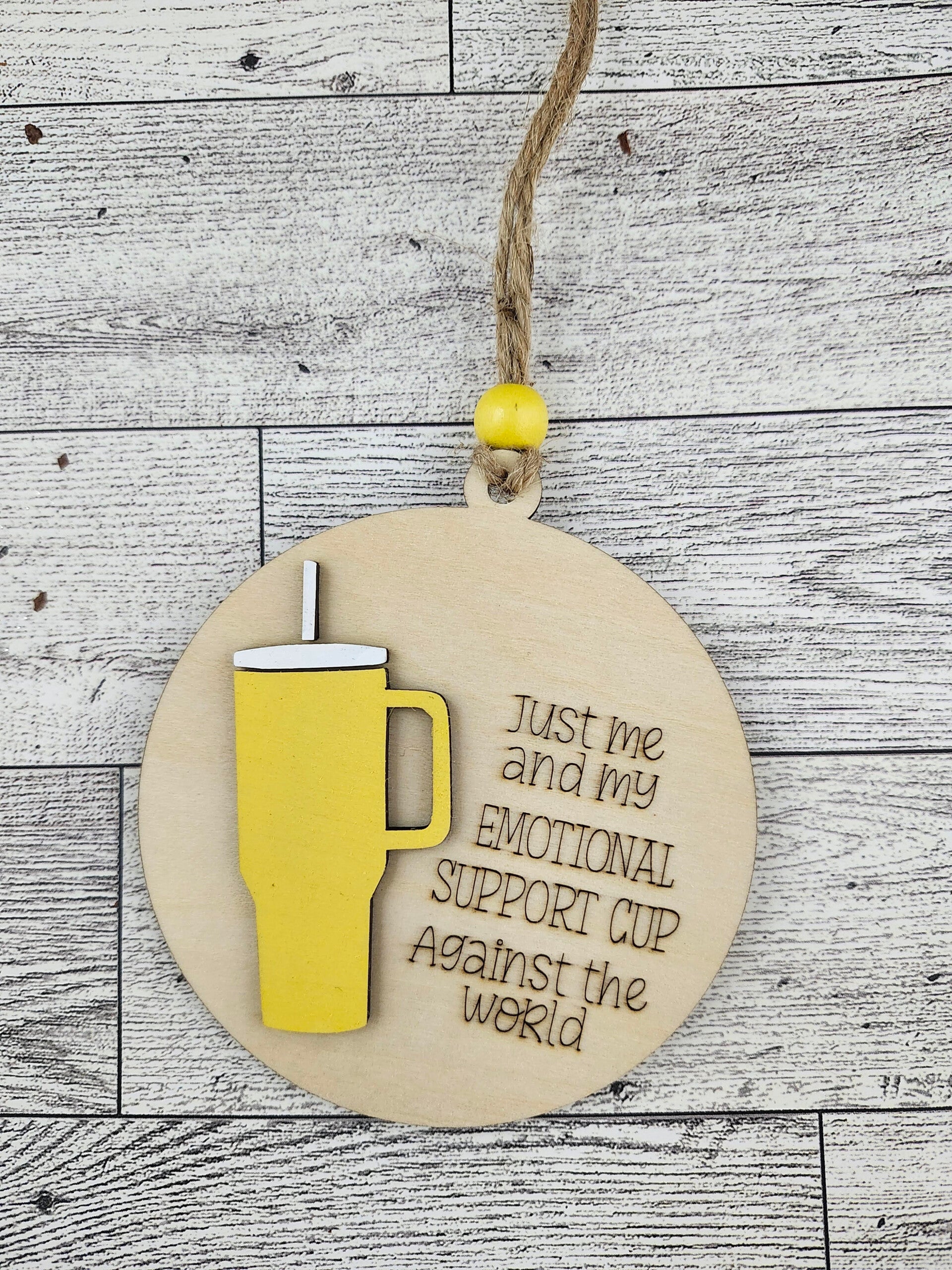 A small, festive Tumbler ornament, 3.5 inches in diameter, with a comical phrase. You pick the color for the tumbler and will come with a white lid and straw.