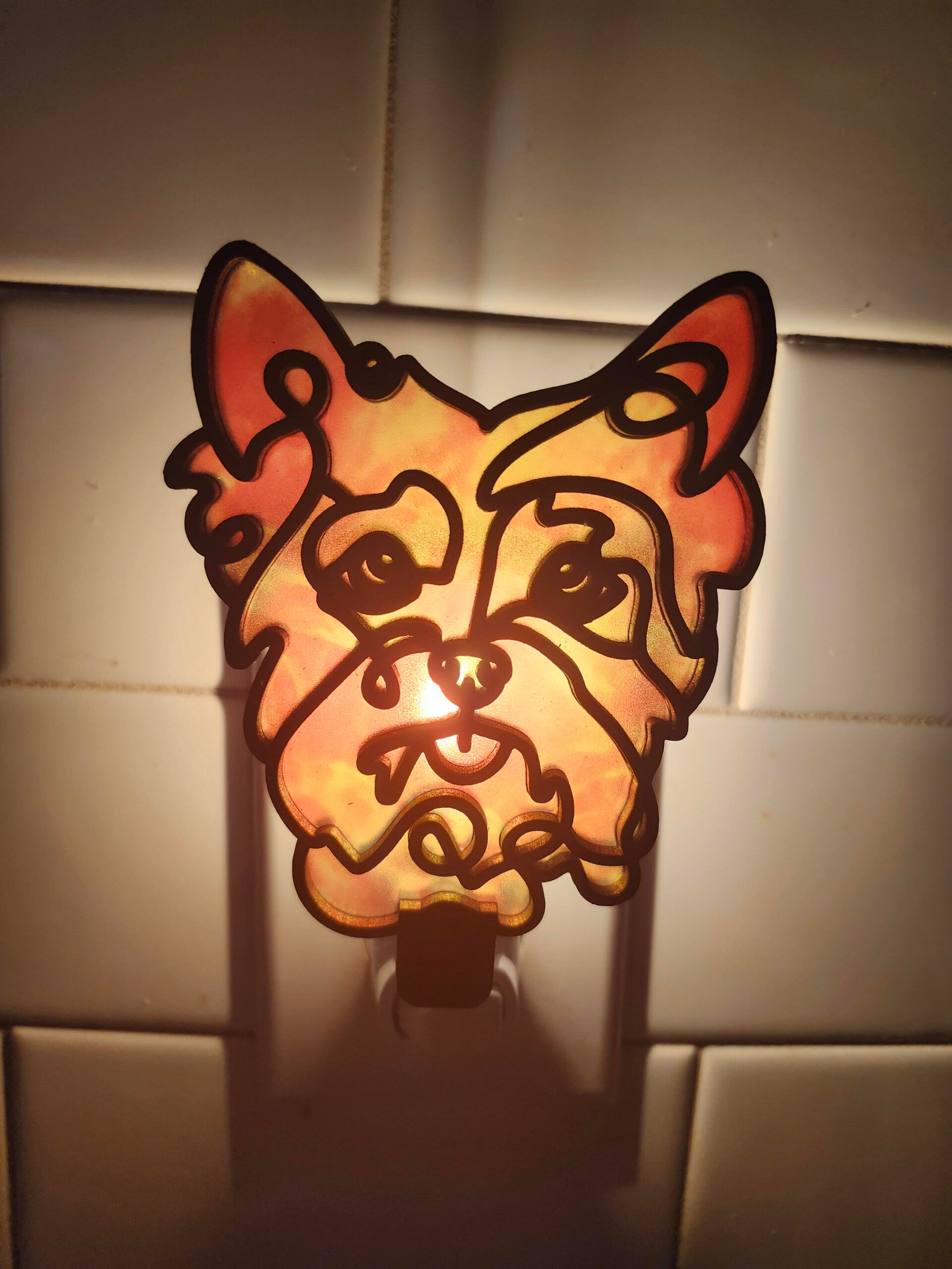 Illuminate your space with this adorable Yorkie Nightlight, a perfect blend of craftsmanship and charm. This handcrafted nightlight is laser-cut from wood and features a transparent acrylic sheet, allowing the soft glow of the bulb to shine through beautifully.